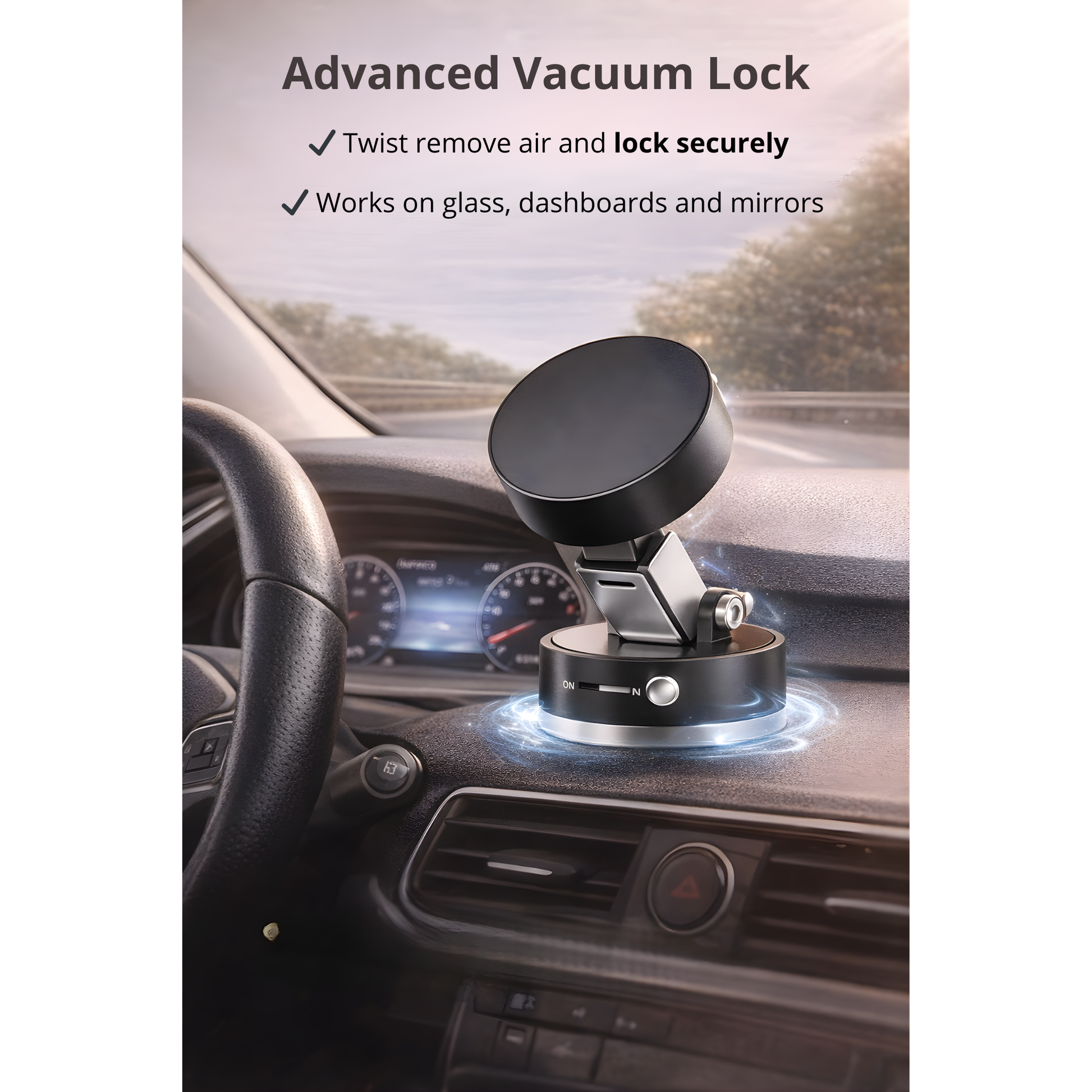 Dual Suction Power: Combines magnetic force and vacuum suction for extra stability on surfaces such as dashboards, mirrors, glass, or metal.